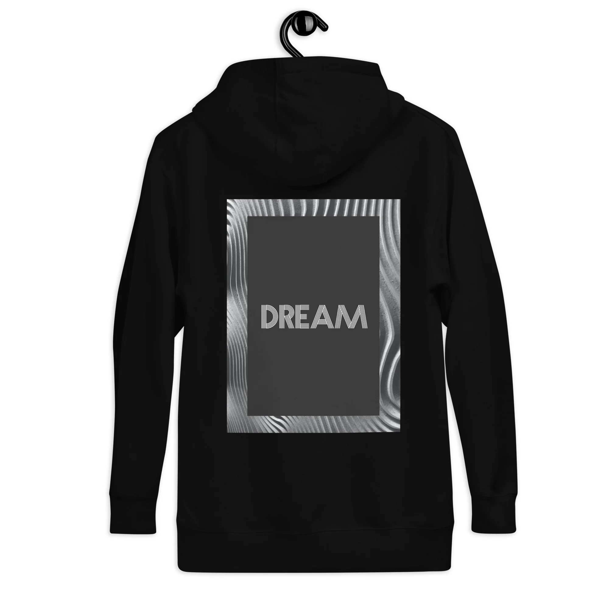 The unique abstract art design on the back of the hoodie is a statement piece that will make you stand out in any crowd. The black background contrasts beautifully with the intricate white and gray patterns, creating a bold and sophisticated look.